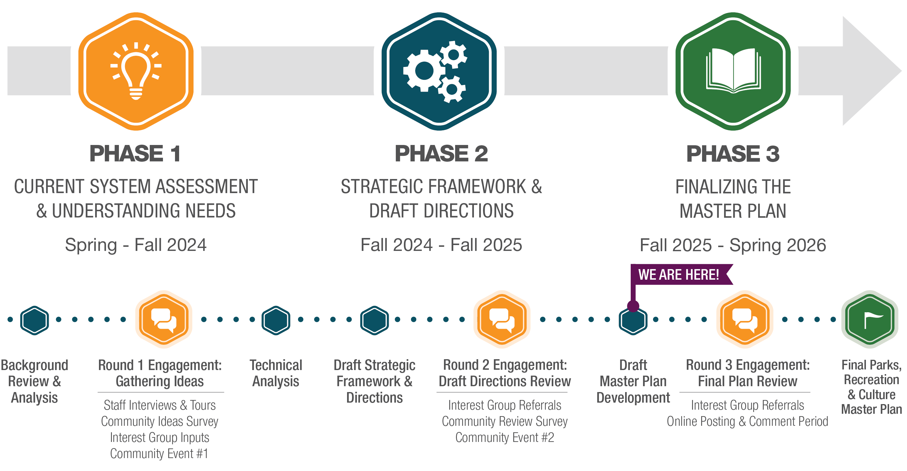 The planning process is happening over the 3 phases (shown below). In each phase, there will be opportunities for you to participate through events, surveys, and other activities.