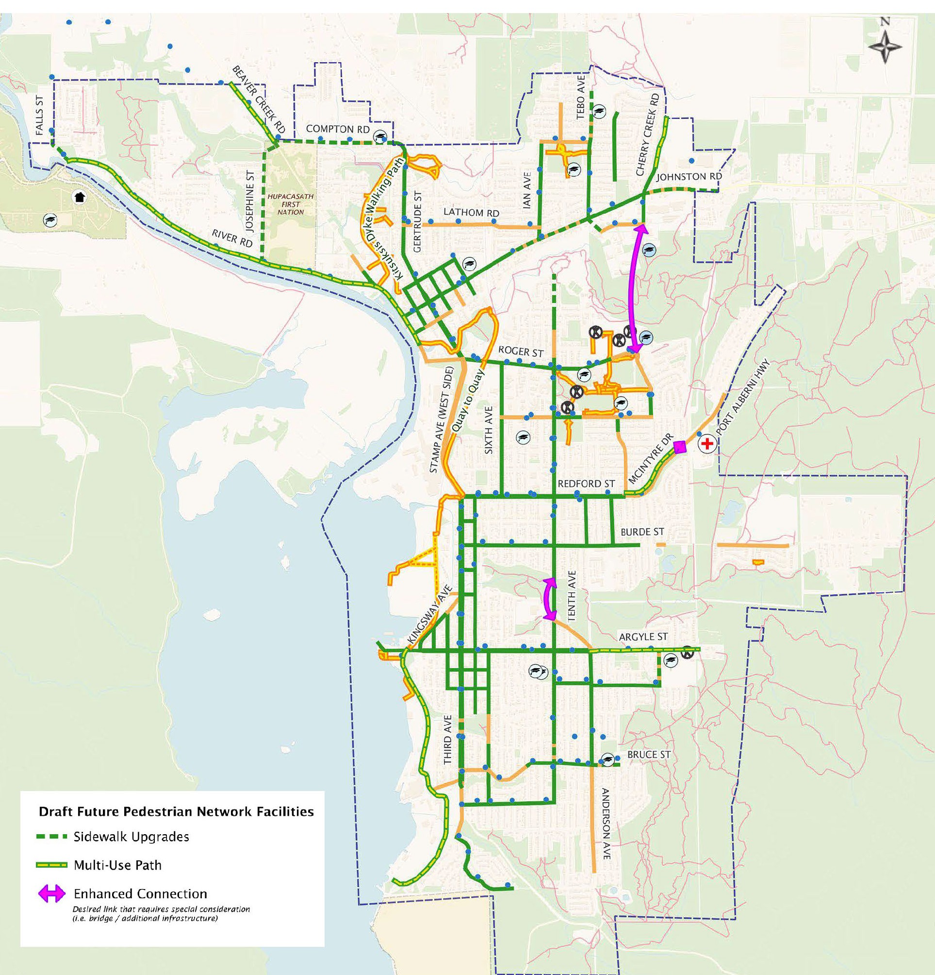 Enhanced Pedestrian Connections: Address locations where a new active transportation link is needed, but where the appropriate solution may vary, such as pedestrian overpasses or off-street pathways. The Draft Pedestrian Network Plan identifies the need for a Roger Creek crossing (for active transportation), an enhanced cycling connection across the Tenth Avenue “Dip” between Dunbar Street and North Park Drive, and a new connection crossing Port Alberni Highway to connect the potential McIntyre Drive multi-use pathway to the hospital.