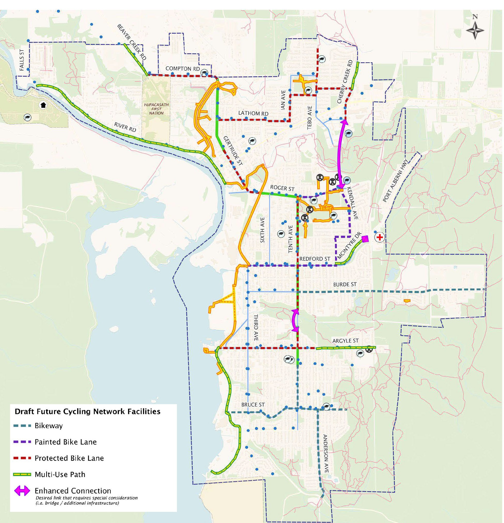 Enhanced Cycling Connections: Address locations where new cycling links are needed but where the appropriate solution may vary, such as new bridges, overpasses, underpasses, or off-street connections, consistent with those identified in the pedestrian network. The Draft Bicycle Network Plan identifies the need for a Roger Creek crossing (for active transportation), an enhanced cycling connection across the Tenth Avenue “Dip” between Dunbar Street and North Park Drive, and a new connection crossing Port Alberni Highway to connect the potential McIntyre Drive multi-use pathway to the hospital. These connections are consistent with what is proposed in the Draft Pedestrian Network Plan.